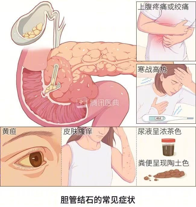 胆总管结石:常引起胆管梗阻,导致胆道扩张、腹痛、黄疸,甚至继发化脓性感染,表现为寒战、高热。
